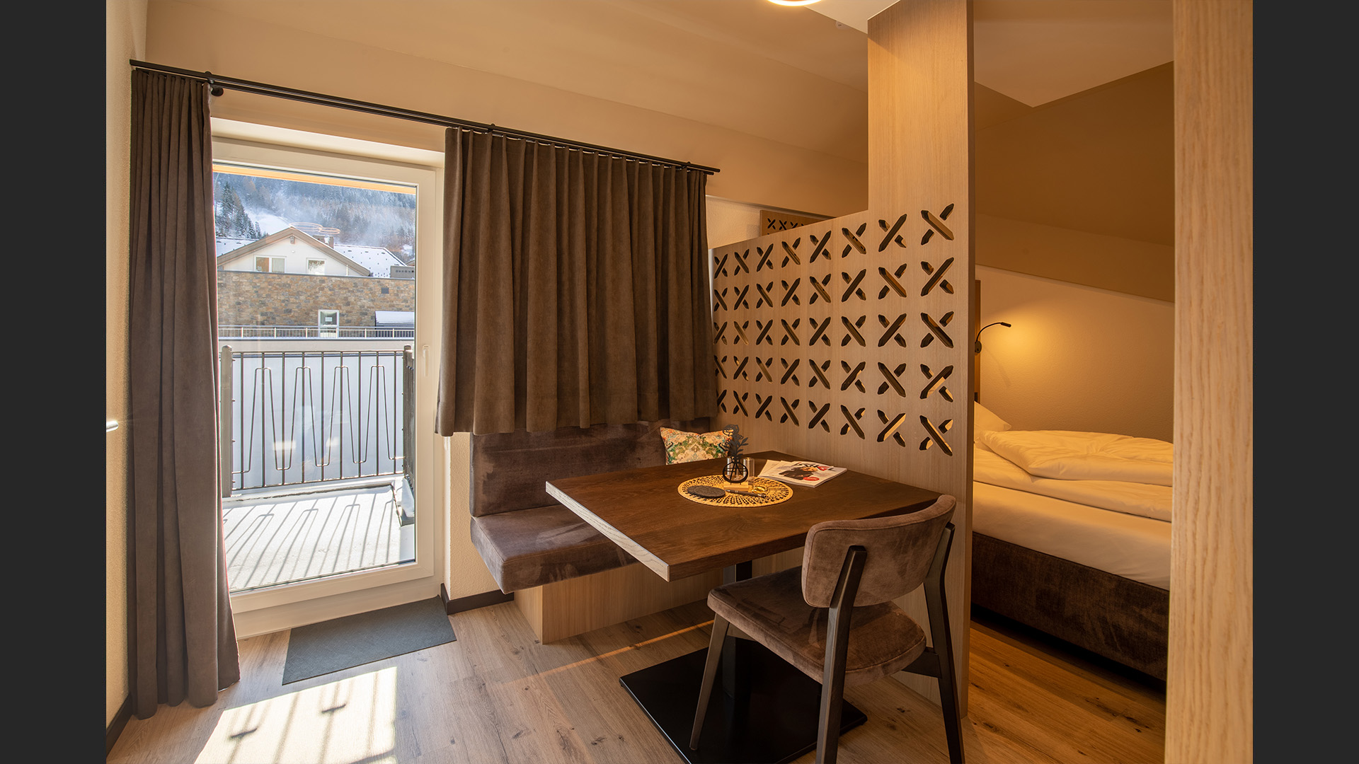 Das 28m² große Studio befindet sich im zweiten Obergeschoß und bietet 1 Doppelbett mit separatem Badezimmer. Der wunderschöne Wohnbereich verfügt über eine voll ausgetattete Küche mit Sitzecke und einem Südbalkon mit herrlichen Ausblick. Gerne wandeln wir auf Anfrage das Doppelbett in zwei Einelbetten um.